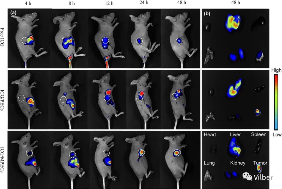 图注:分别静脉注射游离的ICG,ICG/PECs和ICG/MPECs后小鼠体内和离体荧光成像图。(a)静脉注射后不同时间点的HCT-116荷瘤小鼠体内荧光图像。肿瘤部位用白色虚线圈表示。(b)静脉注射后48小时处死小鼠收集的主要器官和肿瘤的离体荧光图像。